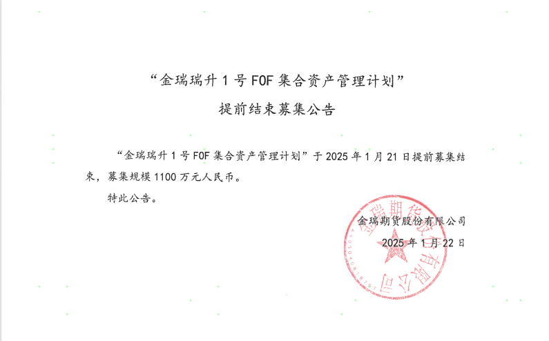 “金瑞瑞升1号FOF集合资产管理计划”提前结束募集公告