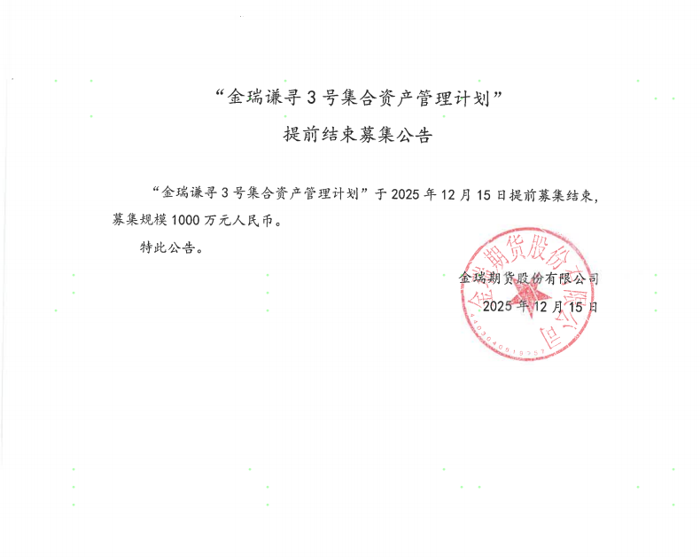 “金瑞谦寻3号集合资产管理计划”提前结束募集公告